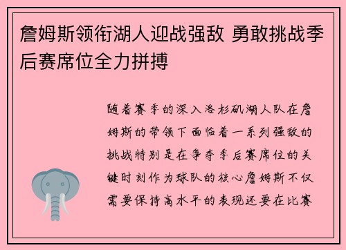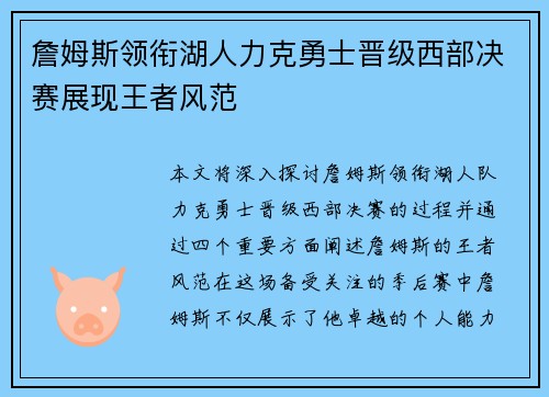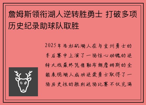 本文将深入探讨詹姆斯领衔湖人队力克勇士晋...