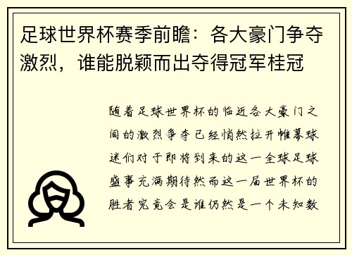 随着足球世界杯的临近,各大豪门之间的激烈...