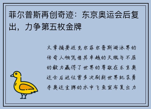 文章摘要:迈克尔·菲尔普斯,游泳界的传奇...