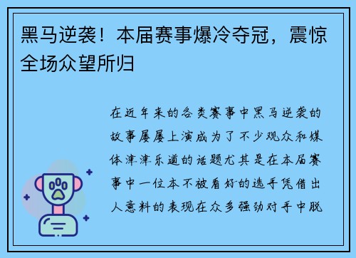 在近年来的各类赛事中,"黑马"逆袭的故事...