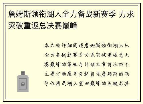 本文将详细阐述詹姆斯领衔湖人队全力备战新...