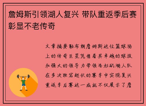 文章摘要:勒布朗·詹姆斯,这位篮球场上的...