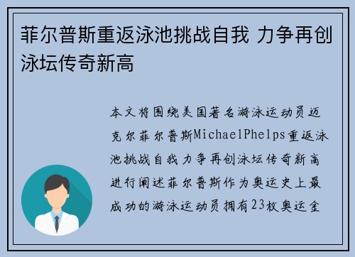 本文将围绕美国著名游泳运动员迈克尔·菲尔...