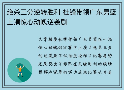 文章摘要:杜锋带领广东男篮在一场惊心动魄...
