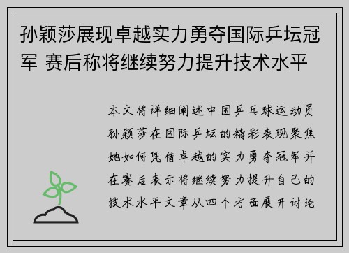 本文将详细阐述中国乒乓球运动员孙颖莎在国...