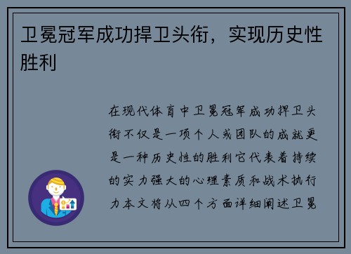 在现代体育中,卫冕冠军成功捍卫头衔,不仅...
