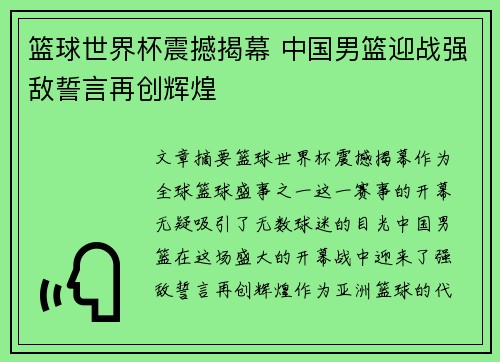 文章摘要:篮球世界杯震撼揭幕,作为全球篮...