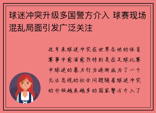 近年来,球迷冲突在世界各地的体育赛事中愈...