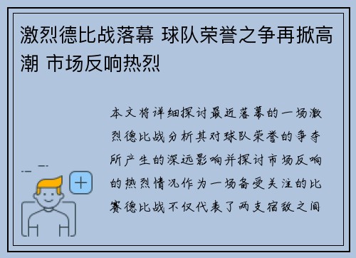本文将详细探讨最近落幕的一场激烈德比战,...