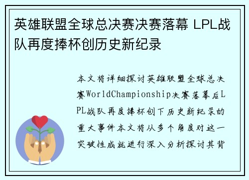 本文将详细探讨英雄联盟全球总决赛(Wor...
