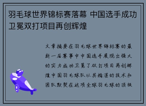 文章摘要:在羽毛球世界锦标赛的最新一届赛...